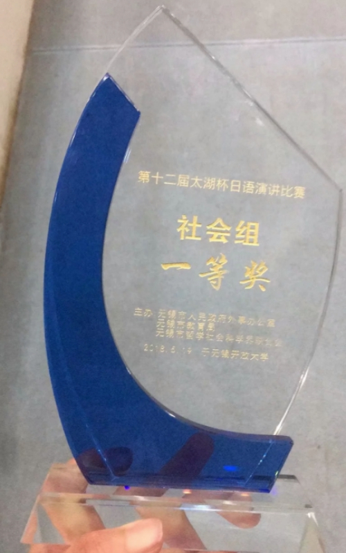 第12届太湖杯日语演讲比赛-明日叶学员余学荣获“社会组一等奖”水晶杯