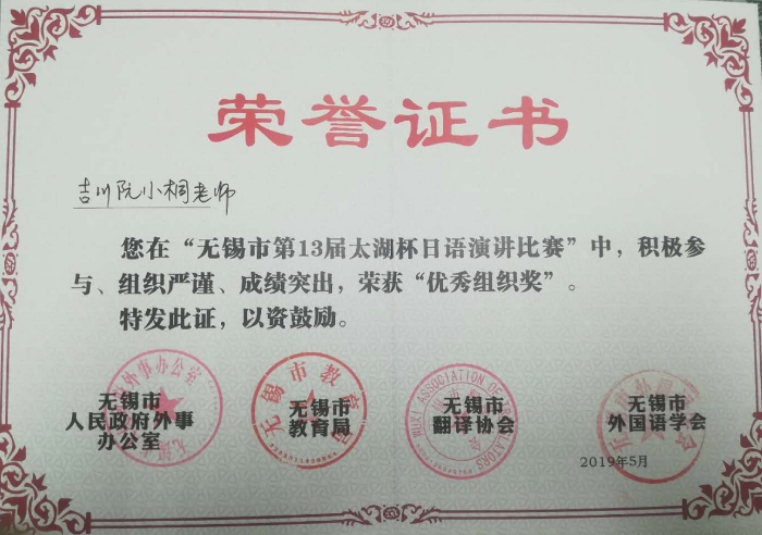 第13届太湖杯日语演讲比赛-明日叶阮小桐老师获“优秀组织奖”