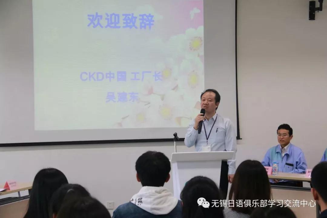 CKD公司工厂长代表公司致欢迎词,欢迎无锡吉川日语培训翻译学校、无锡日语俱乐部和无锡科技职业学院一行拜访公司。并介绍了CKD公司的发展历程,以及对于打造校企合作机制的期待。