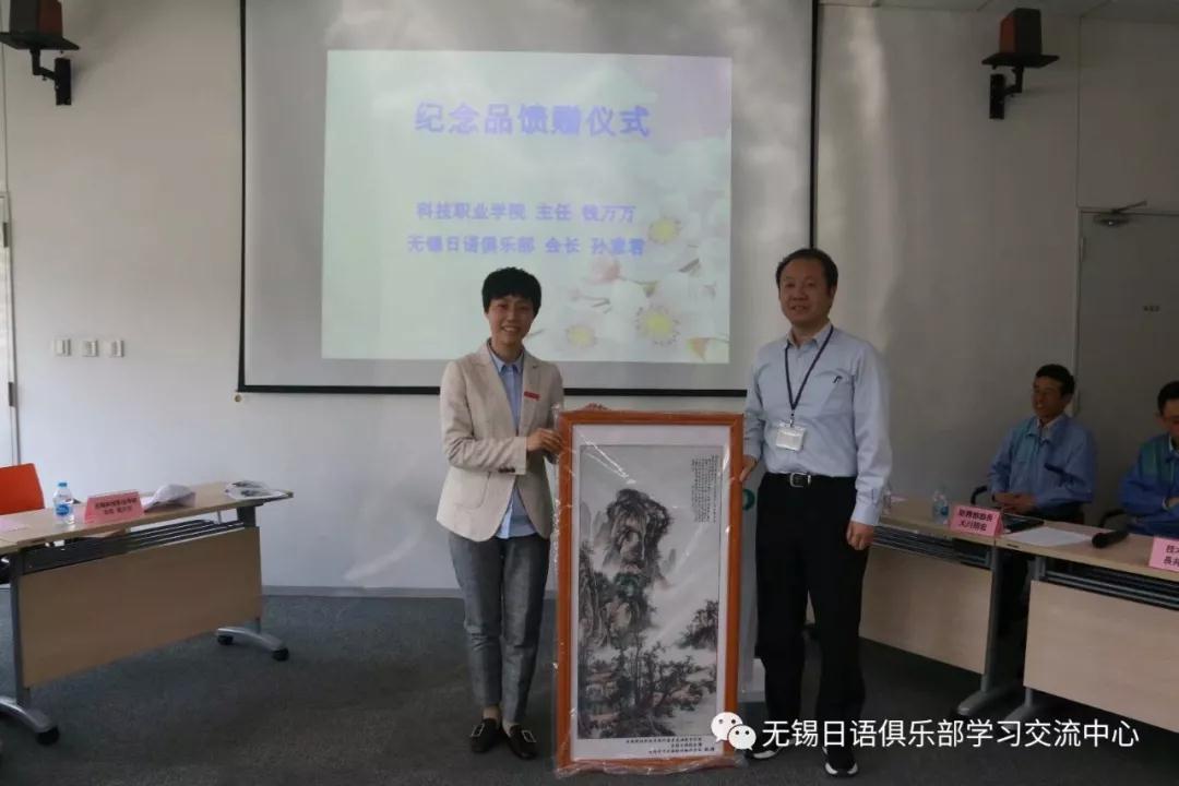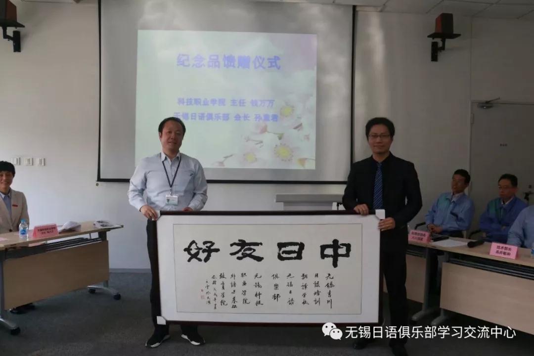 在活动即将结束之际,来自无锡吉川日语培训翻译学校的孙老师,代表吉川和无锡日语俱乐部给CKD公司馈赠了纪念品,希望双方能够长期一直合作下去,来自科技学院的钱老师也代表学院向企业方颁发了纪念品,随着馈赠仪式的举办,也将现场的氛围推向了最高潮。(无锡日本留学专题讲座--就在明日叶)