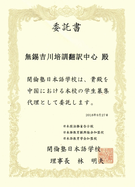 开伦塾日本语学校授予无锡明日叶日本留学中心“招生委托书”: