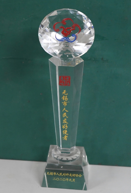 恭喜冈老师荣获“无锡人民友好使者”水晶奖杯!无锡日语培训机构吉川·无锡日本留学明日叶