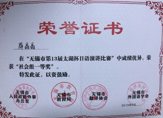 二、明日叶优秀学员-余学荣:荣获无锡市第十二届太湖杯日语演讲比赛社会部“一等奖”