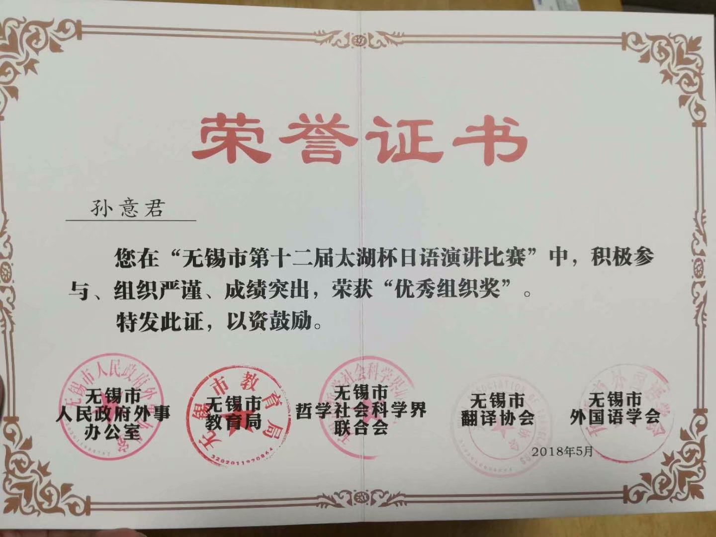 第12届太湖杯日语演讲比赛-明日叶孙意君校长获“优秀组织奖”
