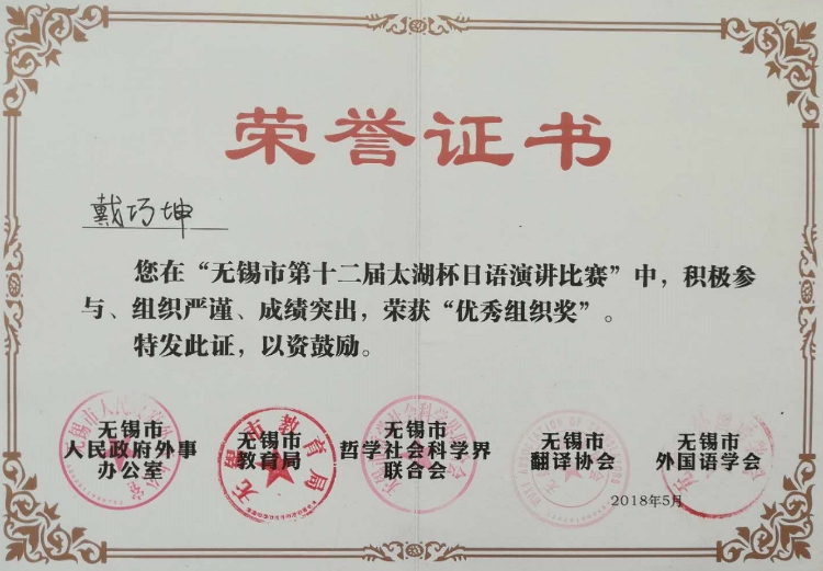 第12届太湖杯日语演讲比赛-明日叶戴巧坤老师获“优秀组织奖”