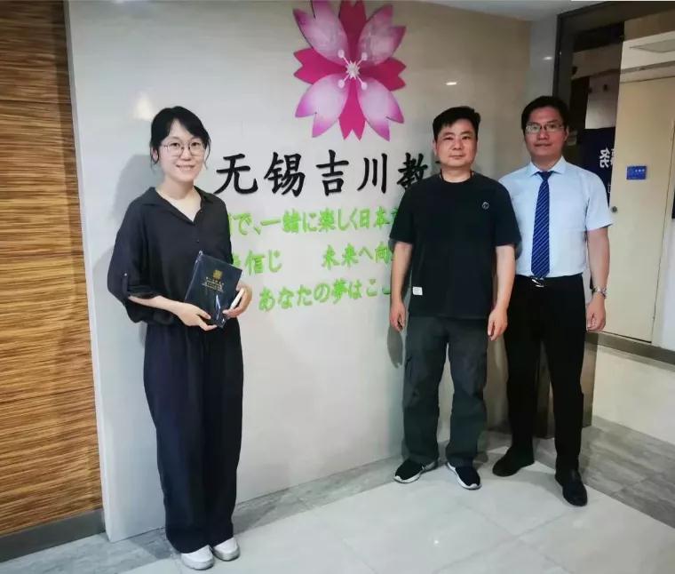 结束了短暂的拜访后,双方一起在吉川背景墙前面进行合影留念。(无锡留学日本中介--明日叶)
