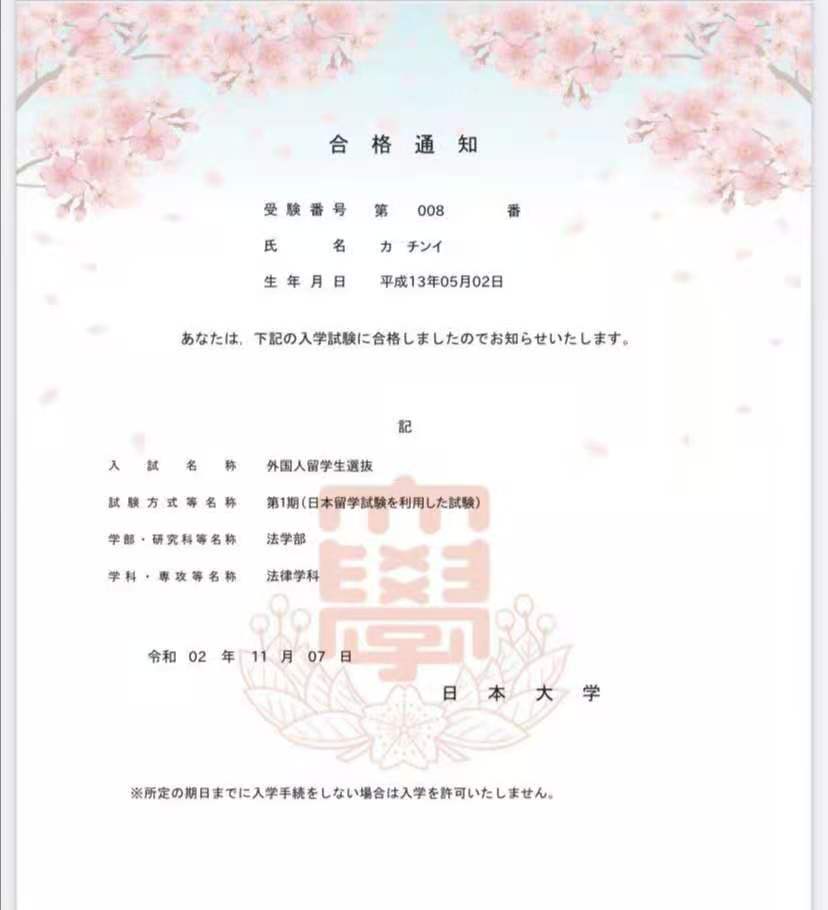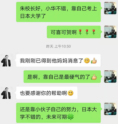 2020年11月7日,这是值得纪念的一天,明日叶优秀学员华辰轶,曾今非常向往的日本名校-“日本大学”,以及非常向往的专业“法学”总算向他伸出了橄榄枝,(无锡日本留学中介机构排名--明日叶)其母亲也第一时间向我们发来了喜报,真的是隔着屏幕都能感受到学生妈妈的激动心情!真的是功夫不负有心人啊!真的是经过了很多的困难与挫折~在N次落榜之后~仍然顶住压力~不放弃不服输!最终圆梦自己喜欢的“日本大学”法学院!作为明日叶的所有老师,真心替他感到高兴!(无锡日语留学班--就在明日叶)这是一所非常不错的学校,专业也非常不错,将来如果做日本律师是非常不错的选择,未来可期~!!